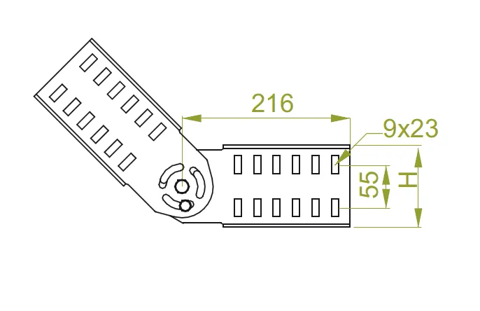 З'єднання кабельних лотків, прокладених під різними кутами. Повне регулювання кута з фіксацією. Матеріал S - Сталь, оцинкована методом Сендзіміра PN-EN 10346:2015-09 Доступні варіанти оздоблення: F - гарячеоцинкована сталь PN-EN ISO 1461:2023-02 E - нержавіюча сталь L - фарбування у стандартний колір RAL Додаткова інформація Універсальний шарнірний з'єднувач для кабельного лотка великого прольоту та системи сходів. Для складання використовуйте 12 комплектів гвинтів SGKM8x16 Повне регулювання кута!