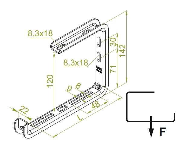 Підвішування кабельних трас. Матеріал S - Сталь, оцинкована методом Сендзіміра PN-EN 10346:2015-09 Доступні варіанти оздоблення: F - гарячеоцинкована сталь PN-EN ISO 1461:2023-02 E - нержавіюча сталь L - фарбування у стандартний колір RAL