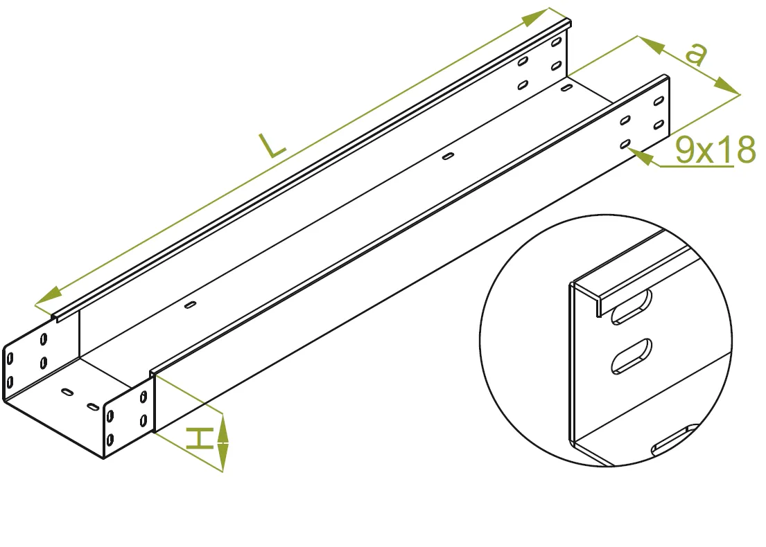 Маршрутизація кабелю. Матеріал F - гарячеоцинкована сталь PN-EN ISO 1461:2023-02 Доступні варіанти оздоблення: E - нержавіюча сталь L - фарбування у стандартний колір RAL Додаткова інформація Перевага: Додаткові верхні вигини збільшують вантажопідйомність та захищають кабелі від пошкоджень під час прокладання. Для монтажу використовуйте 10 комплектів шурупів SGKFM8x14 або SGFM8x14. Примітка Інтегровані з'єднувачі. Збірка без додаткових з'єднувачів.