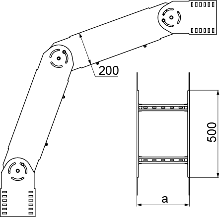 Зміна напрямку траси кабелю. Повне регулювання кута з механізмом блокування. Матеріал S - Сталь, оцинкована методом Сендзіміра PN-EN 10346:2015-09 Доступні варіанти оздоблення: F - гарячеоцинкована сталь PN-EN ISO 1461:2023-02 E - нержавіюча сталь L - фарбування у стандартний колір RAL Додаткова інформація – використовуйте 16 болтів SGKM8x16 для з’єднання арматури з драбинами