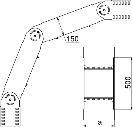 Зміна напрямку траси кабелю. Повне регулювання кута з механізмом блокування. Матеріал S - Сталь, оцинкована методом Сендзіміра PN-EN 10346:2015-09 Доступні варіанти оздоблення: F - гарячеоцинкована сталь PN-EN ISO 1461:2023-02 E - нержавіюча сталь L - фарбування у стандартний колір RAL Додаткова інформація – використовуйте 16 болтів SGKM8x16 для з’єднання арматури з драбинами