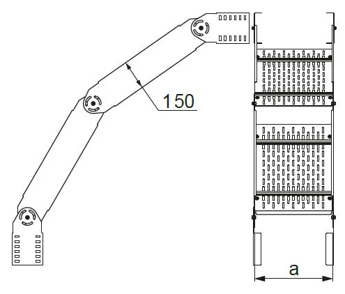 Зміна напрямку траси кабелю. Повне регулювання кута з механізмом блокування. Матеріал S - Сталь, оцинкована методом Сендзіміра PN-EN 10346:2015-09 Доступні варіанти оздоблення: F - гарячеоцинкована сталь PN-EN ISO 1461:2023-02 E - нержавіюча сталь L - фарбування у стандартний колір RAL Додаткова інформація – використовуйте болти SGKM8x16 для з'єднання фітинга з лотком