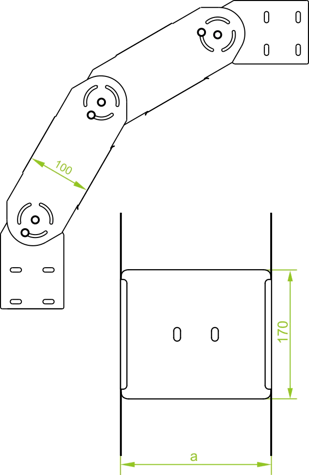 Відхилення під час прокладання кабелю. Повне регулювання кута з фіксацією. Матеріал F - гарячеоцинкована сталь PN-EN ISO 1461:2023-02 Доступні варіанти оздоблення: E - нержавіюча сталь L - фарбування у стандартний колір RAL Додаткова інформація Для монтажу використовуйте гвинт SGKFM8x14 або SGFM8x14.