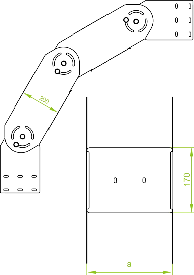 Зміна напрямку траси кабелю. Повне регулювання кута з механізмом блокування. Матеріал F - гарячеоцинкована сталь PN-EN ISO 1461:2023-02 Доступні варіанти оздоблення: E - нержавіюча сталь L - фарбування у стандартний колір RAL Додаткова інформація – для кріплення пропонуємо болти SGKFM8x14 або SGFM8x14