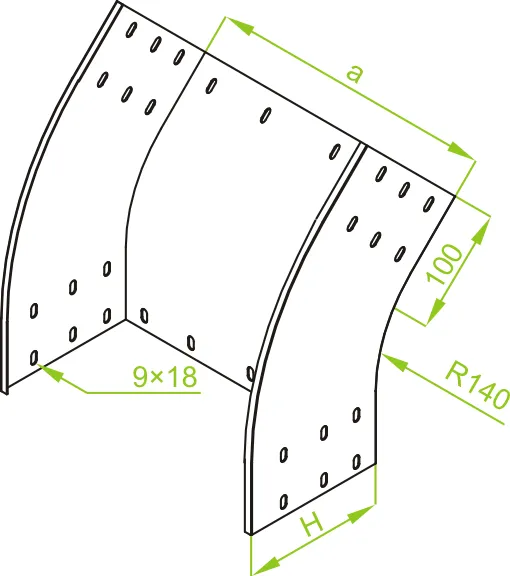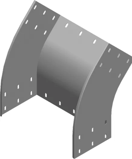 Зміна напрямку кабельної траси. Матеріал F - гарячеоцинкована сталь PN-EN ISO 1461:2023-02 Доступні варіанти оздоблення: E - нержавіюча сталь L - фарбування у стандартний колір RAL Додаткова інформація – для підключення фітинга до лотка використовуйте з'єднувач LCC... або комплект з'єднувачів LZC... та болти SGKFM8x14 або SGFM8x14