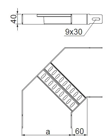 Зміна напрямку кабельної траси Матеріал F - гарячеоцинкована сталь PN-EN ISO 1461:2023-02 На запит: E - нержавіюча сталь Додаткова інформація – для складання використовуйте з'єднувачі LDOUH30 та гвинти SGKFM8x16