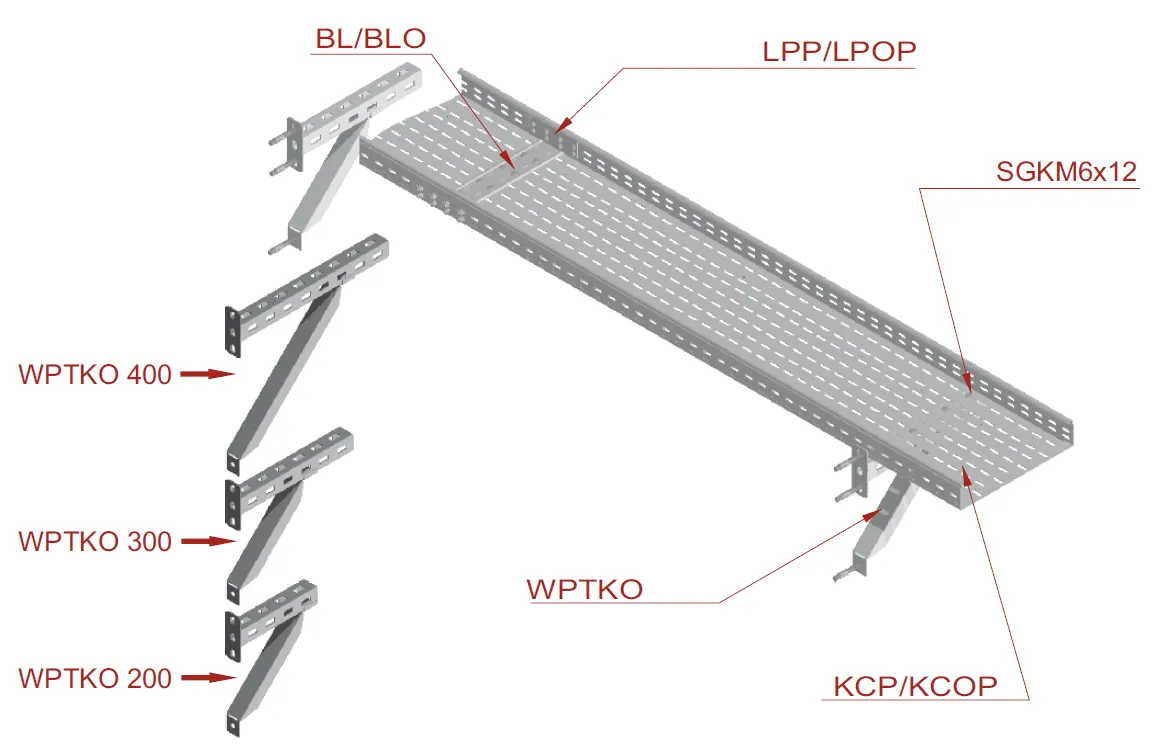 Монтаж лотків, кабельних драбин та сітчастих лотків. Матеріал F - гарячеоцинкована сталь PN-EN ISO 1461:2023-02 Доступні варіанти оздоблення: E - нержавіюча сталь Додаткова інформація Для монтажних лотків використовуйте 2 комплекти SGKM6x12
