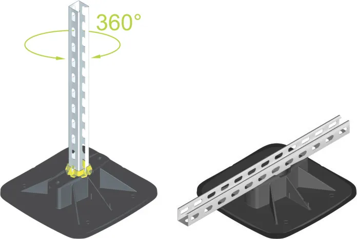 Модульна опорна система для прокладання кабельних трас, обладнання для кондиціонування повітря, труб, чилерів, доріжок, сонячних панелей, фотоелектричних панелей тощо на дахах. Монтаж на плоских дахах. Система підходить для опорних профілів 40H40 або 41H41.