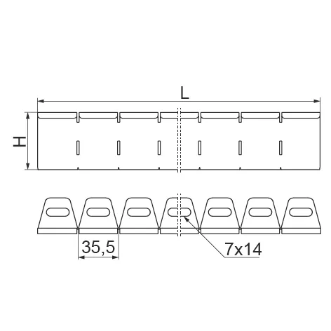 Поздовжній поділ вигину Матеріал S - оцинкована за методом Сендзіміра сталь PN-EN 10346:2015-09 Доступні варіанти обробки: F - гарячеоцинкована сталь PN-EN ISO 1461:2023-02 E - нержавіюча сталь L - фарбування в стандартний колір RAL Додаткова інформація Для монтажу використовуйте комплекти гвинтів SGKM6x12 або SGM6x12
