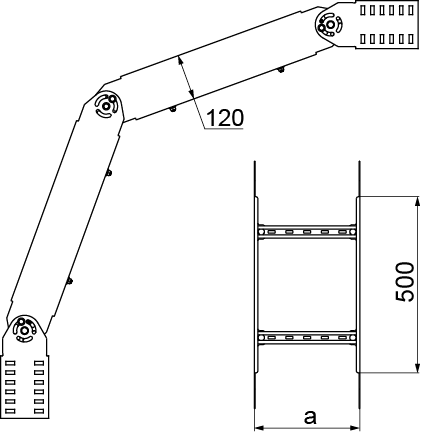 Зміна напрямку траси кабелю. Повне регулювання кута з механізмом блокування. Матеріал S - Сталь, оцинкована методом Сендзіміра PN-EN 10346:2015-09 Доступні варіанти оздоблення: F - гарячеоцинкована сталь PN-EN ISO 1461:2023-02 E - нержавіюча сталь L - фарбування у стандартний колір RAL Додаткова інформація – використовуйте 16 болтів SGKM8x16 для з’єднання арматури з драбинами