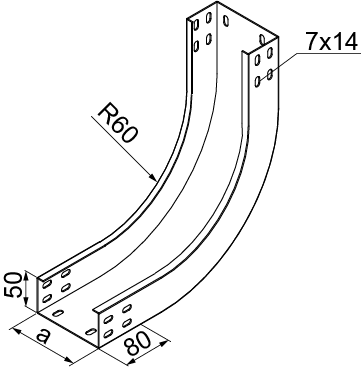 Зміна напрямку кабельної траси. Матеріал F - гарячеоцинкована сталь PN-EN ISO 1461:2023-02 Доступні варіанти оздоблення: E - нержавіюча сталь L - фарбування у стандартний колір RAL Додаткова інформація – для підключення фітинга до лотка використовуйте з'єднувач LCC... або комплект з'єднувачів LZC... та болти SGKFM6x12 або SGFM6x12