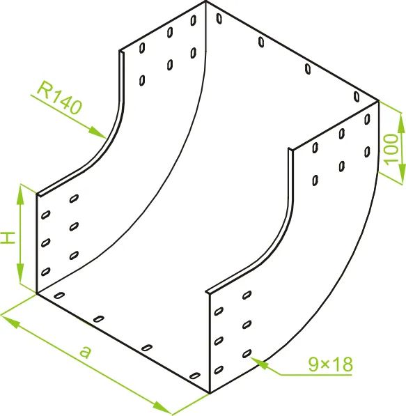 Зміна напрямку кабельної траси. Матеріал F - гарячеоцинкована сталь PN-EN ISO 1461:2023-02 Доступні варіанти оздоблення: E - нержавіюча сталь L - фарбування у стандартний колір RAL Додаткова інформація – для підключення фітинга до лотка використовуйте з'єднувач LCC... або комплект з'єднувачів LZC... та болти SGKFM8x14 або SGFM8x14