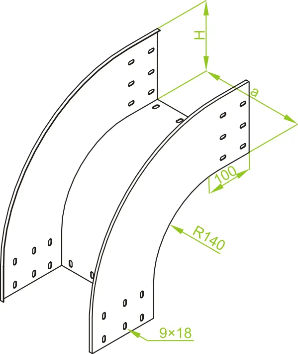 Зміна напрямку кабельної траси. Матеріал F - гарячеоцинкована сталь PN-EN ISO 1461:2023-02 Доступні варіанти оздоблення: E - нержавіюча сталь L - фарбування у стандартний колір RAL Додаткова інформація – для підключення фітинга до лотка використовуйте з'єднувач LCC... або комплект з'єднувачів LZC... та болти SGKFM8x14 або SGFM8x14