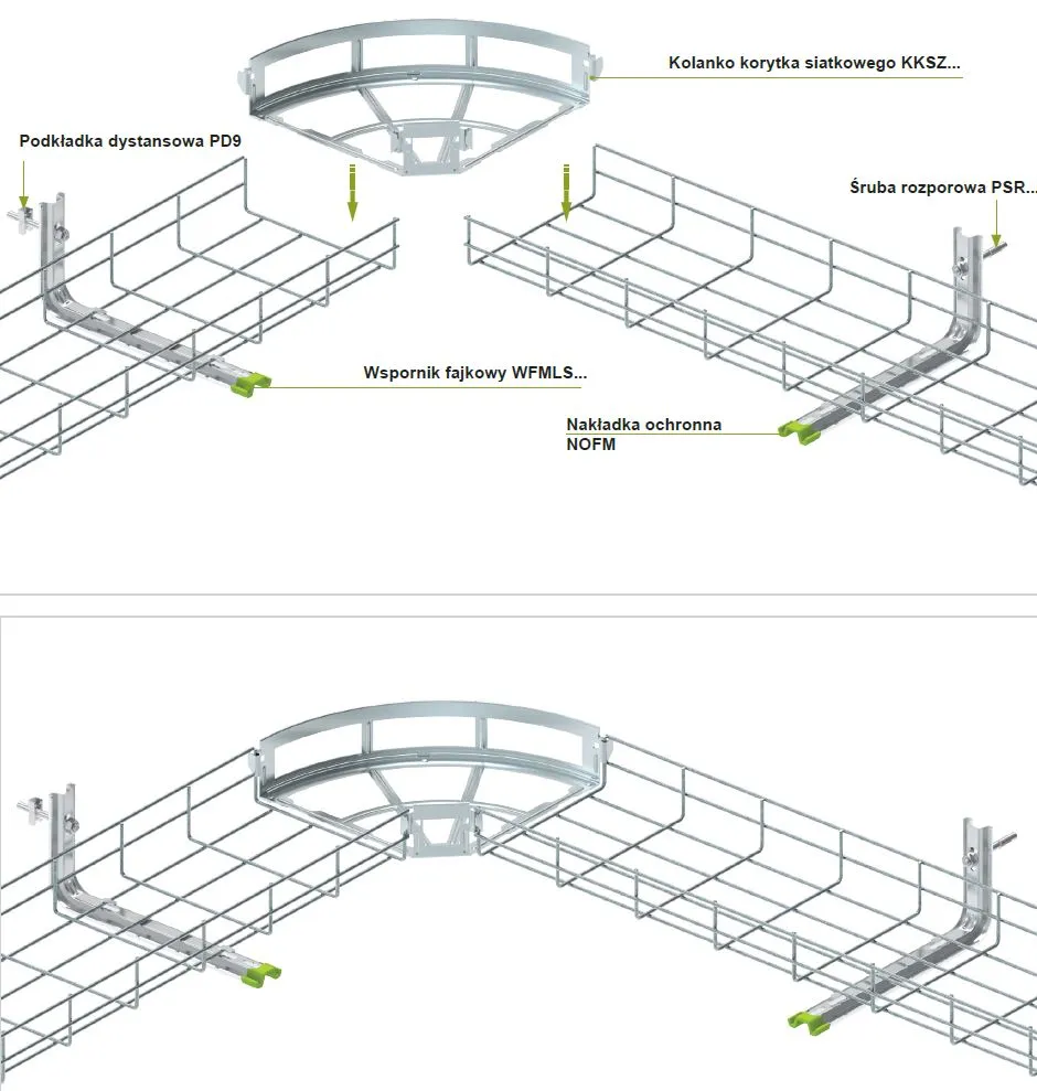 – для ширини понад 200 мм, для з’єднання фітинга з сітчастим лотком, використовуйте: UDKS (бічне підсилення застібного з’єднання) USSN/USSO (з’єднання низу фітинга з лотком)