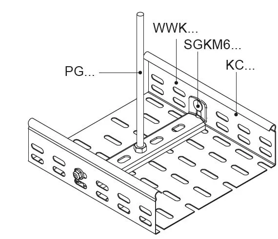 Підвішування кабельних лотків на одній штанзі. Матеріал S - Сталь, оцинкована методом Сендзіміра PN-EN 10346:2015-09 Доступні варіанти оздоблення: FP - оцинкований методом цинкової стружки PN-EN ISO 10683:2018-11 E - нержавіюча сталь L - фарбування у стандартний колір RAL