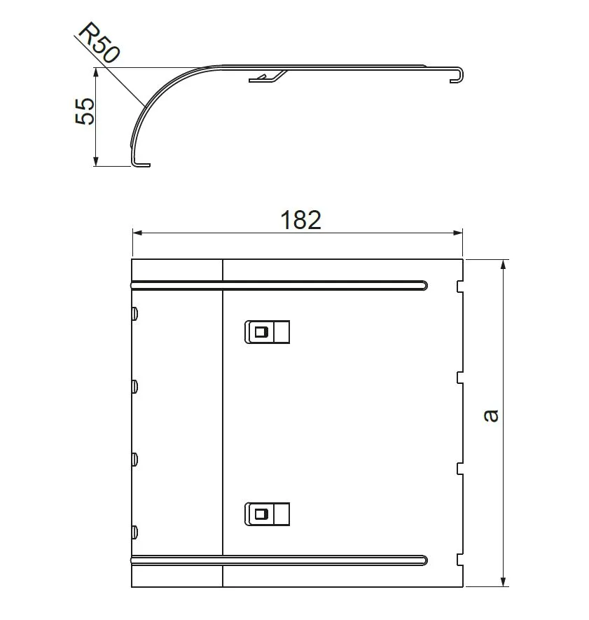 Захист вихідних кабелів від пошкодження на кінці або збоку сітчастого лотка. Матеріал S - Сталь, оцинкована методом Сендзіміра PN-EN 10346:2015-09 Доступні варіанти оздоблення: F - гарячеоцинкована сталь PN-EN ISO 1461:2023-02 E - нержавіюча сталь L - фарбування у стандартний колір RAL Додаткова інформація – легкий вихід кабелю з сітчастого лотка – безгвинтове кріплення