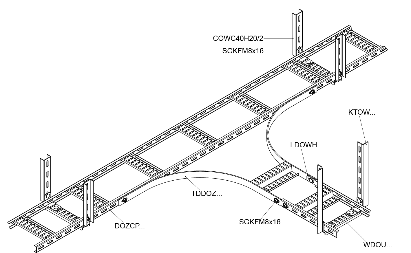 Розгалуження кабельної траси. Матеріал F - гарячеоцинкована сталь PN-EN ISO 1461:2023-02 Доступні варіанти оздоблення: E - нержавіюча сталь Додаткова інформація – використовуйте з'єднувачі LDOUH40 та болти SGKFM8x16 для кріплення