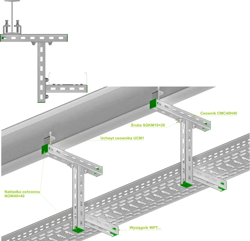 Підвішування кабельних трас. Матеріал FP - оцинкований методом цинкової стружки PN-EN ISO 10683:2018-11 Доступні варіанти оздоблення: E - нержавіюча сталь L - фарбування у стандартний колір RAL Додаткова інформація – UCW1 та UCW2 підходять для каналів: CW...40H22, CW...40H35, CW...40H40