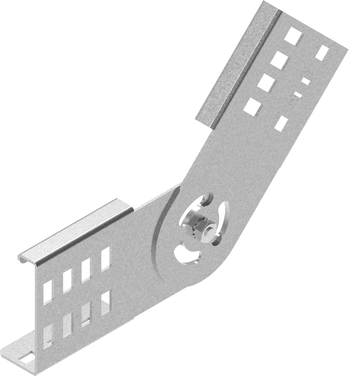 З'єднувальні кабельні драбини, прокладені під різними кутами. Повний діапазон регулювання кута з механізмом блокування. Матеріал S - Сталь, оцинкована методом Сендзіміра PN-EN 10346:2015-09 Доступні варіанти оздоблення: F - гарячеоцинкована сталь PN-EN ISO 1461:2023-02 E - нержавіюча сталь L - фарбування у стандартний колір RAL Додаткова інформація – для кріплення використовуйте 8 комплектів болтів SGKM8x14 або SGM8x14