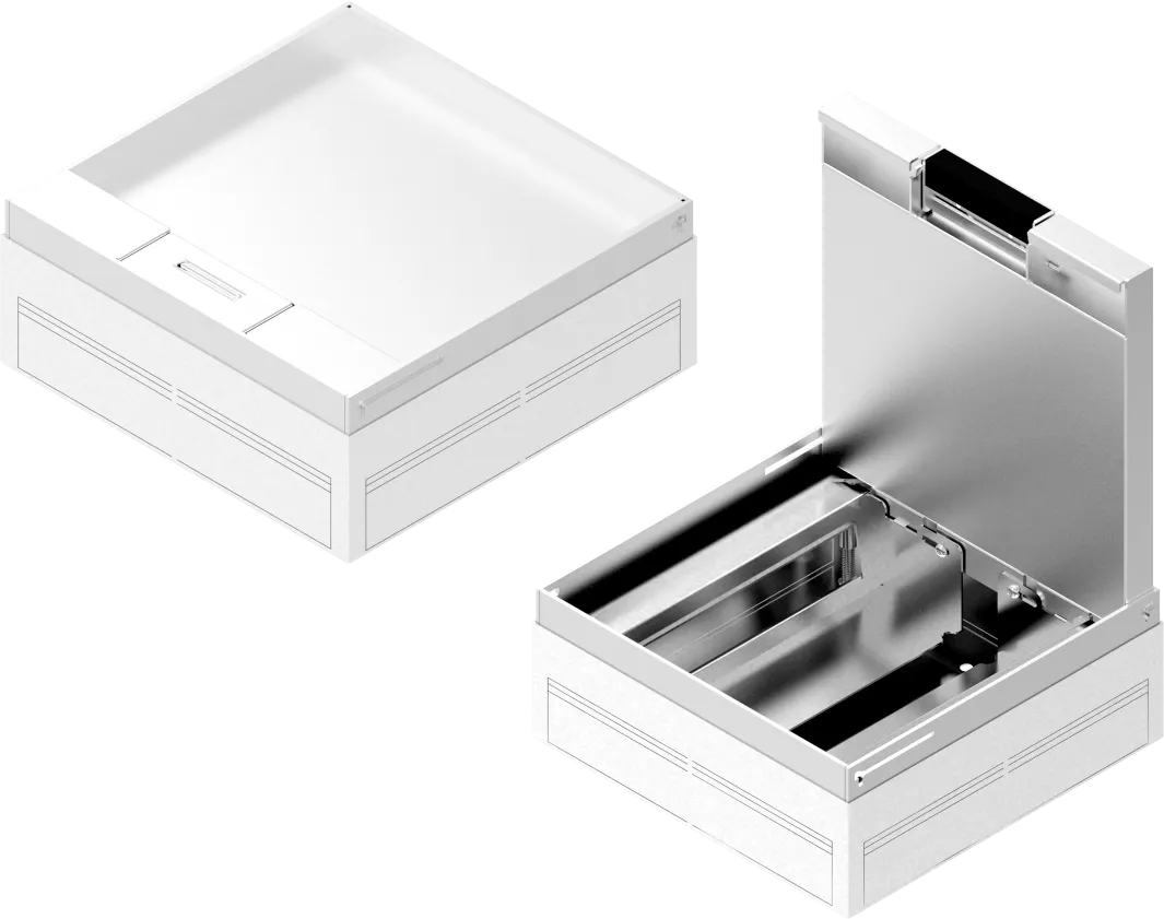Комплектна підлогова коробка, готова до монтажу в інженерних підлогах, фальшпідлогах та бетонних стяжках. Коробка з оцинкованими та алюмінієвими компонентами готова до використання в сухому середовищі.