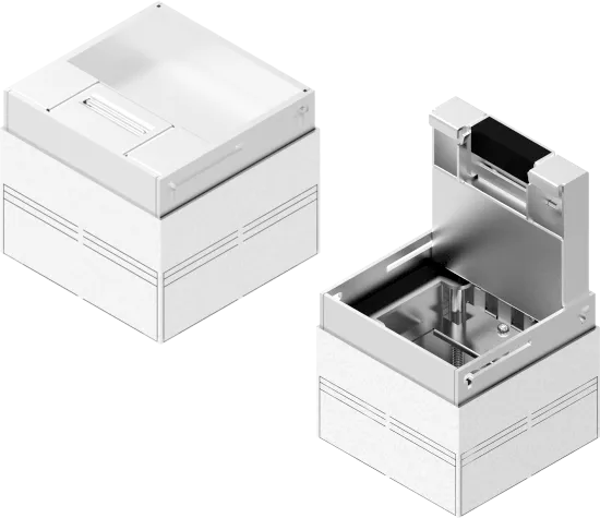 Комплектна підлогова коробка, готова до монтажу в інженерних підлогах, фальшпідлогах та бетонних стяжках. Коробка з оцинкованими та алюмінієвими компонентами готова до використання в сухому середовищі.