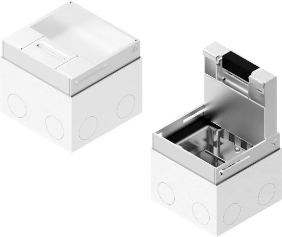 Комплектна підлогова коробка, готова до монтажу в інженерних підлогах, фальшпідлогах та бетонних стяжках. Коробка з оцинкованими та алюмінієвими компонентами готова до використання в сухому середовищі.