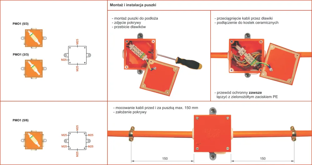 З'єднання та розгалуження кабелів і кабелів в установках із постійною функцією пожежної безпеки E30-E90. Матеріал E - нержавіюча сталь L (RAL 2004) - порошкове покриття RAL 2004 Додаткова інформація Можливе застосування кабельних вводів M4025.