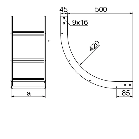 Відхилення під час прокладання кабелю. Матеріал S - Сталь, оцинкована методом Сендзіміра PN-EN 10346:2015-09 Доступні варіанти оздоблення: F - гарячеоцинкована сталь PN-EN ISO 1461:2023-02 E - нержавіюча сталь L - фарбування у стандартний колір RAL Додаткова інформація Для складання використовуйте 4 прямих з'єднувача LDCH та 16 комплектів гвинтів SGKM8x14 або SGM8x14